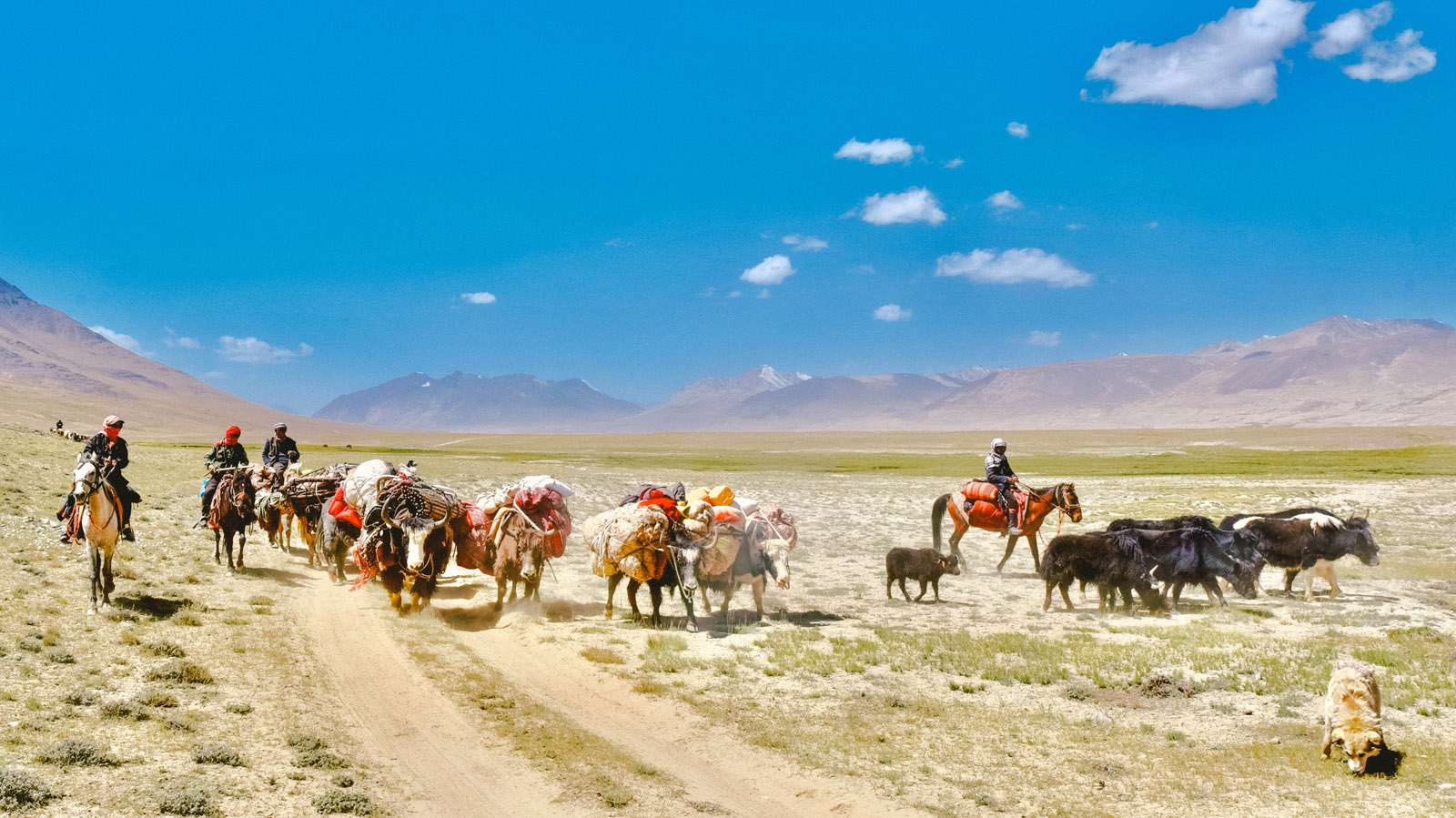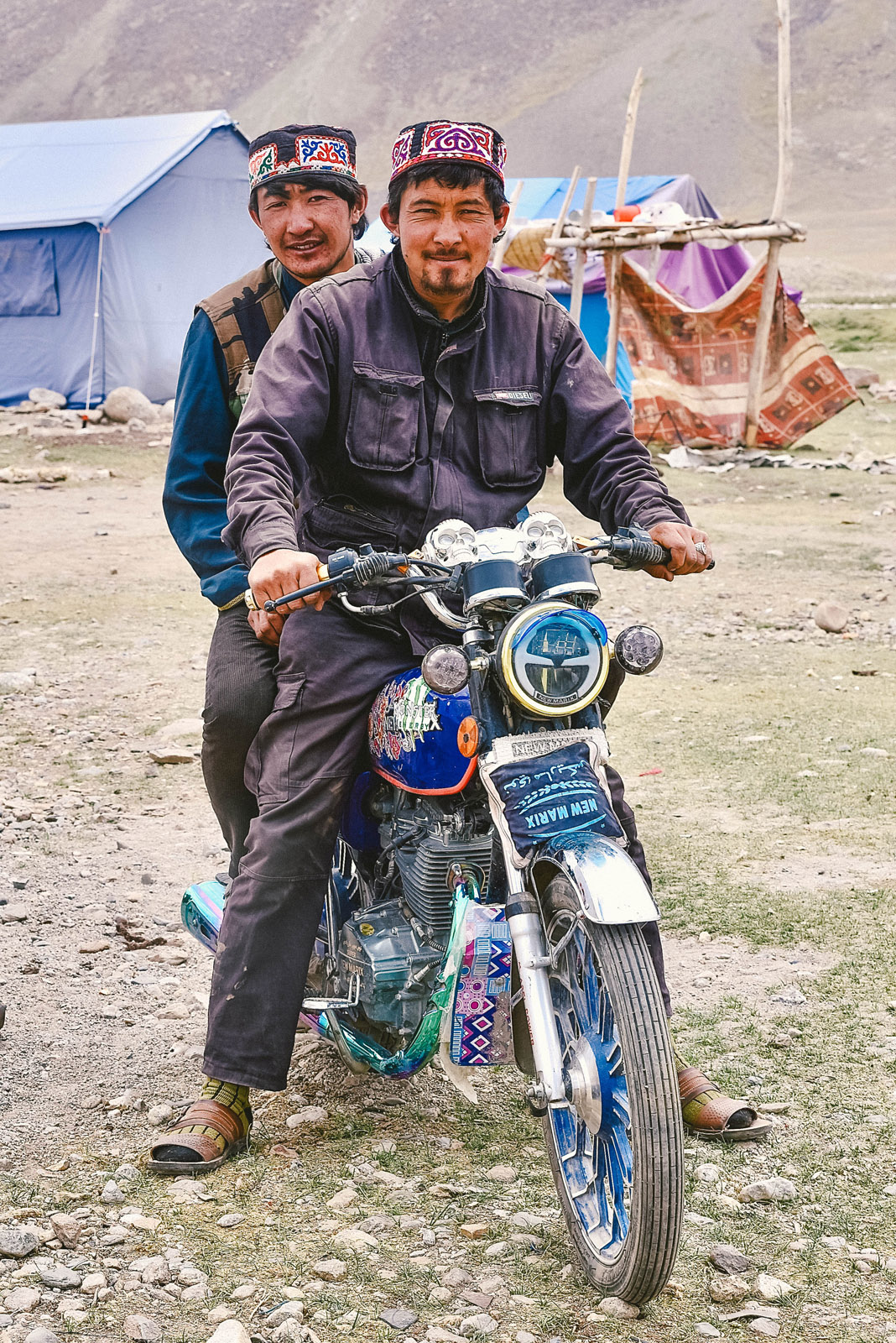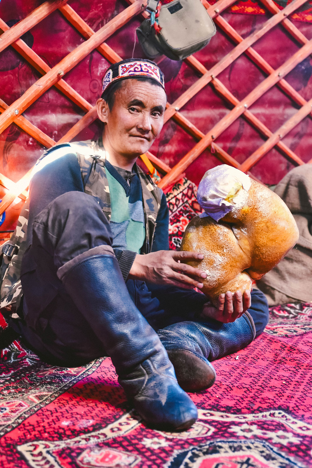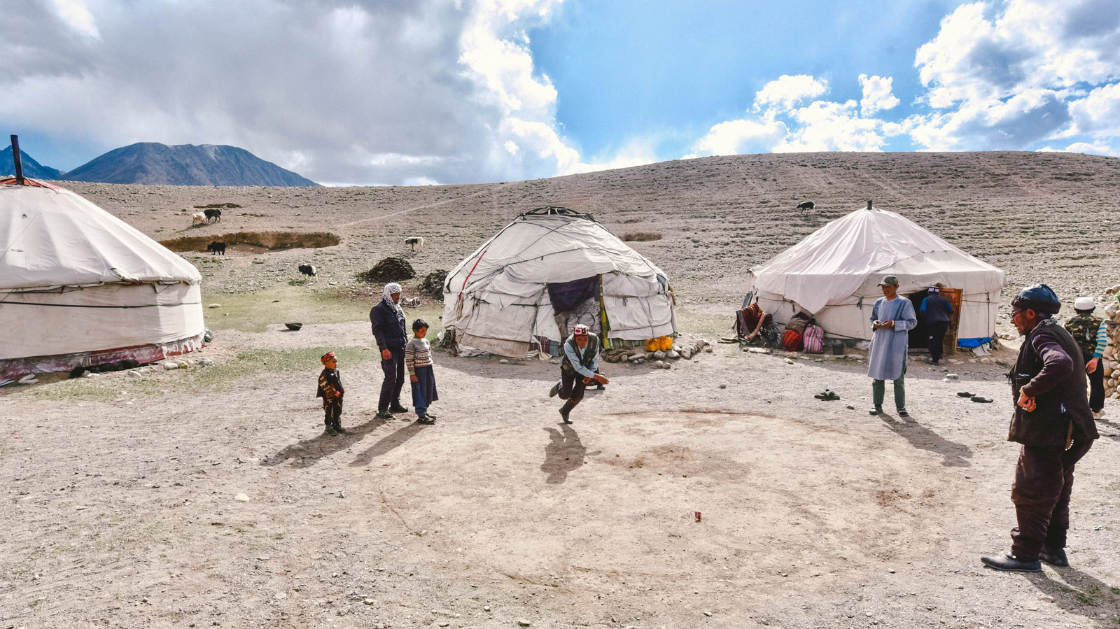 In the afternoon, the men – young and old – begin playing “Ordo” in front of the yurts. Ordo is a traditional Kyrgyz knucklebone game that symbolizes the battle to conquer the Khan’s headquarters. Using a large yak bone, the players try to knock six smaller sheep bones – the last one being the Khan bone – out of a four-meter circle. This is the time for the women to meet undisturbed in one of the yurts for a chat. The atmosphere in the camp is relaxed again.We want to visit more camps. The nearest one is an hours drive. On the way, we encounter five nomads migrating with their animals on the vast, otherwise very lonely plateau. Four of them are traveling on horseback with the yaks. The yurt and household goods are distributed among six yaks. The fifth nomad is following on foot with the sheep and goats. The second camp consists of only two houses and two yurts. We have brought the nomads flour, salt, sugar, apples, and honey. This does not make the reception any friendlier. Our driver advises against continuing on toward the lake. The terrain is becoming increasingly swampy. In addition, Holger is having more and more trouble with the altitude. His face is already completely swollen. Developing pulmonary edema here, like the Australian whom Holger had sent back to Sarhad e Brohil two days earlier, seems too risky to us. Sadly, we start our return journey. Sad because the living conditions up here are so incredibly harsh and sad because we didn’t have enough time to immerse ourselves more deeply in the culture of this admirable people.