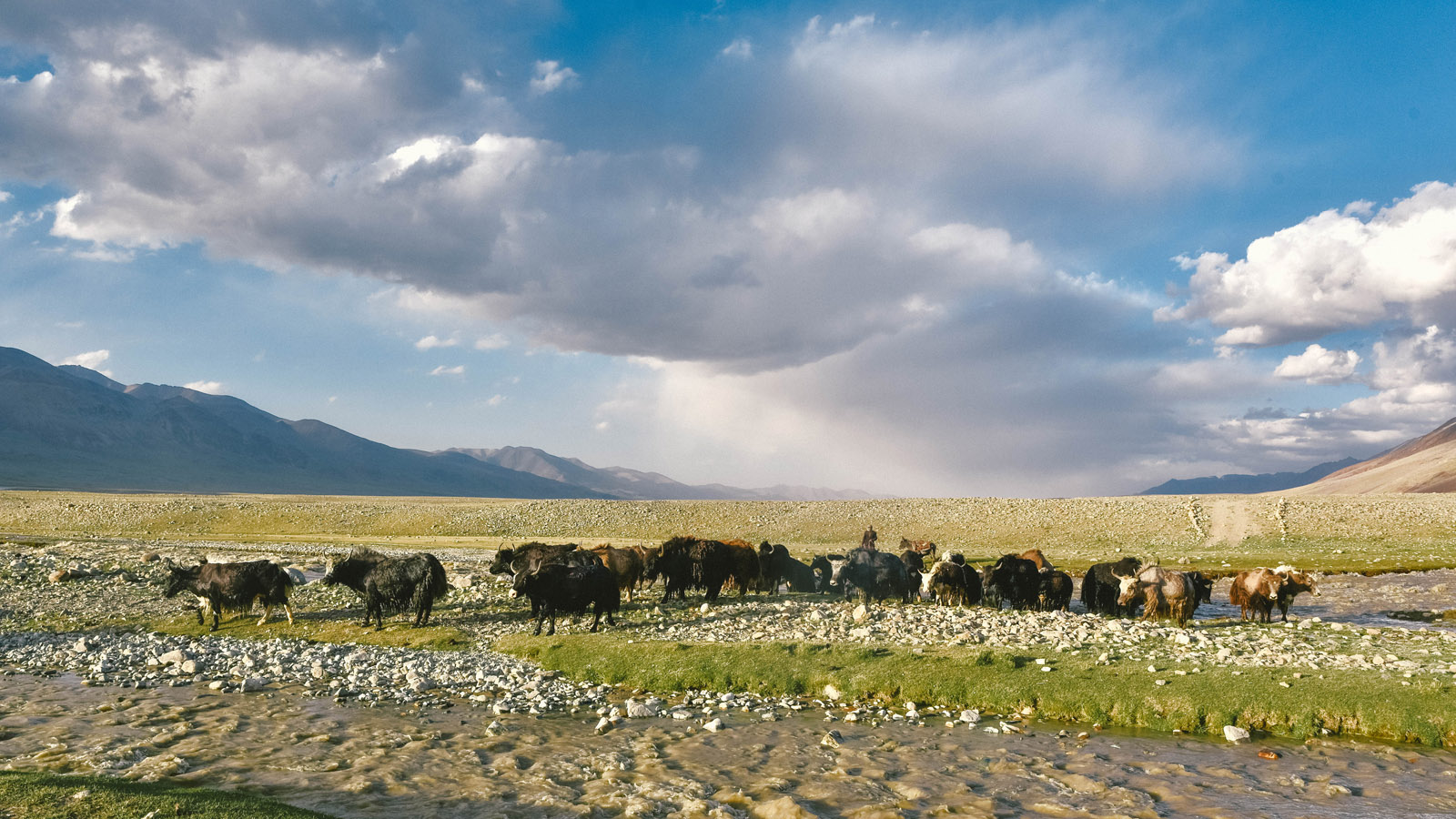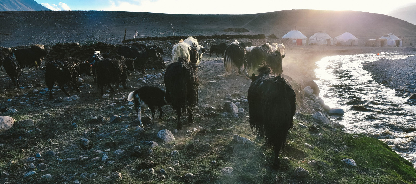 While Eimatambeg is still busy gutting and cutting up the slaughtered animal, the sun sends its last rays over the hill and the animals return from the pasture: first the yak calves from the south, then the adult yaks cross the stream from the east, and finally the sheep and goats come down the hill from the west. The calves are tied up in rows and the goats and sheep are herded into a stone pen. Then the women begin milking the yaks, bringing the calves to their mothers one by one, letting them drink briefly and then milking a few liters. In the morning, before the animals go back out to pasture, the process is repeated.
