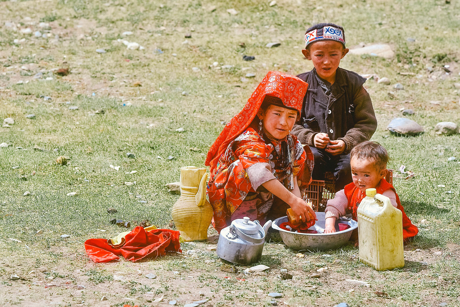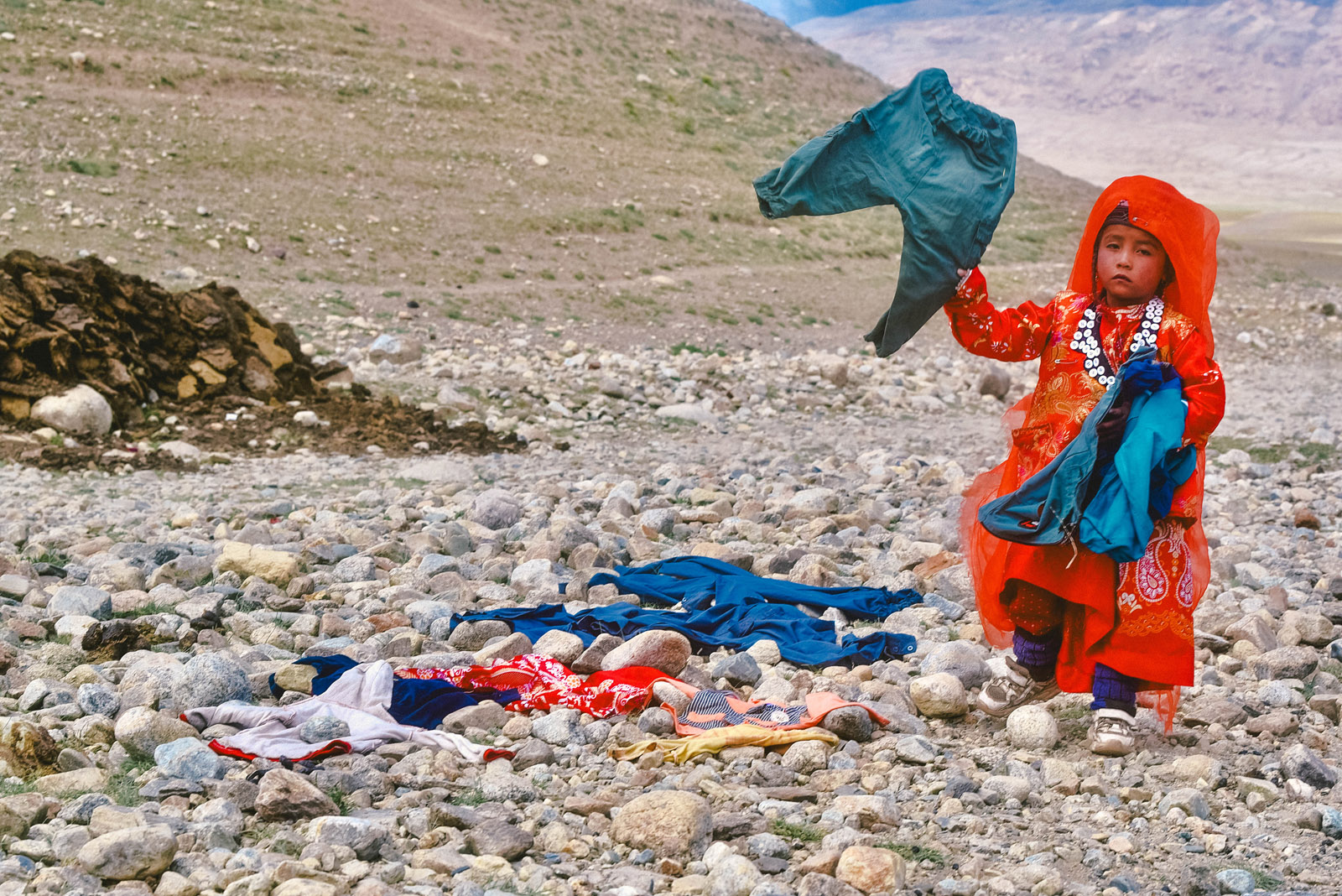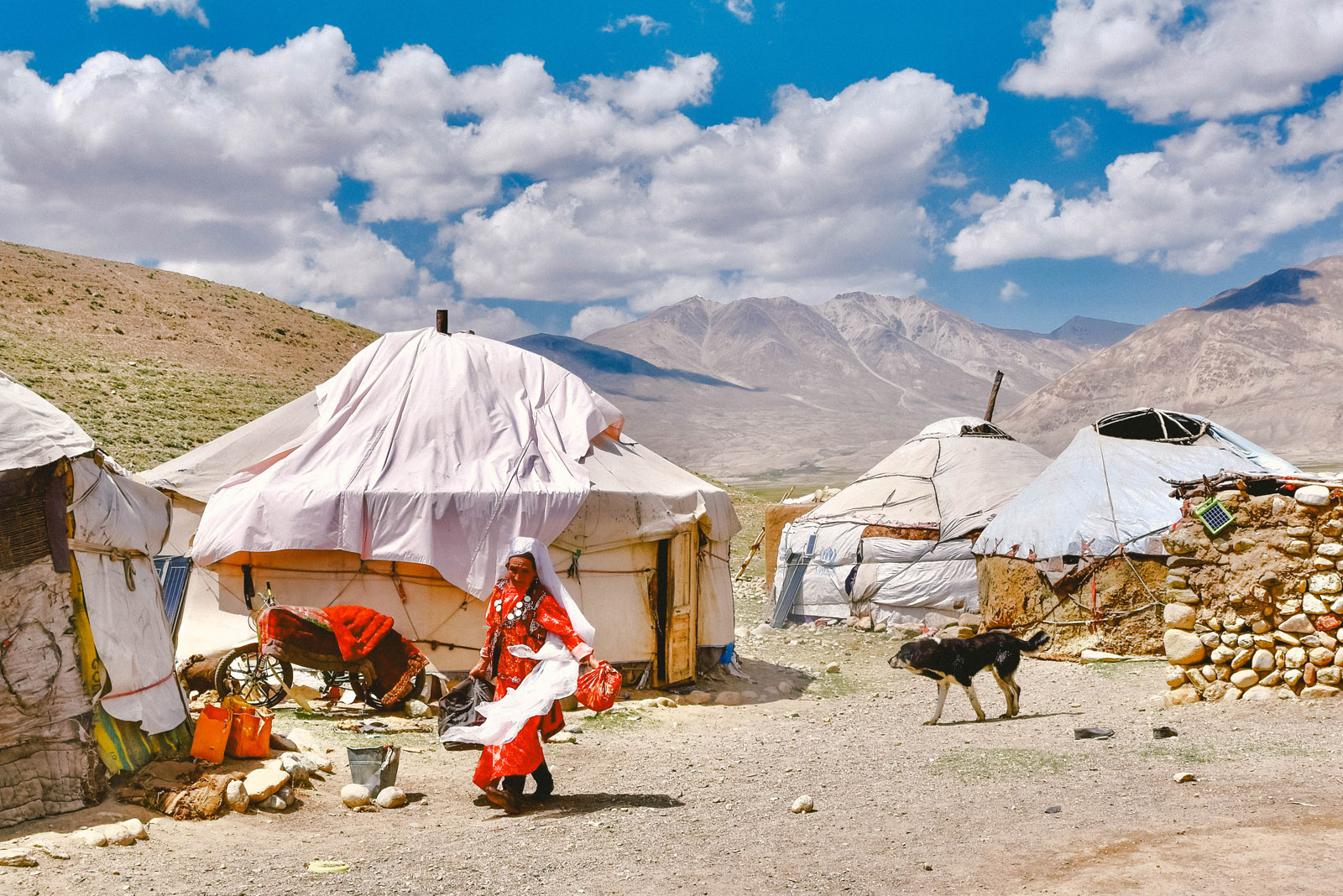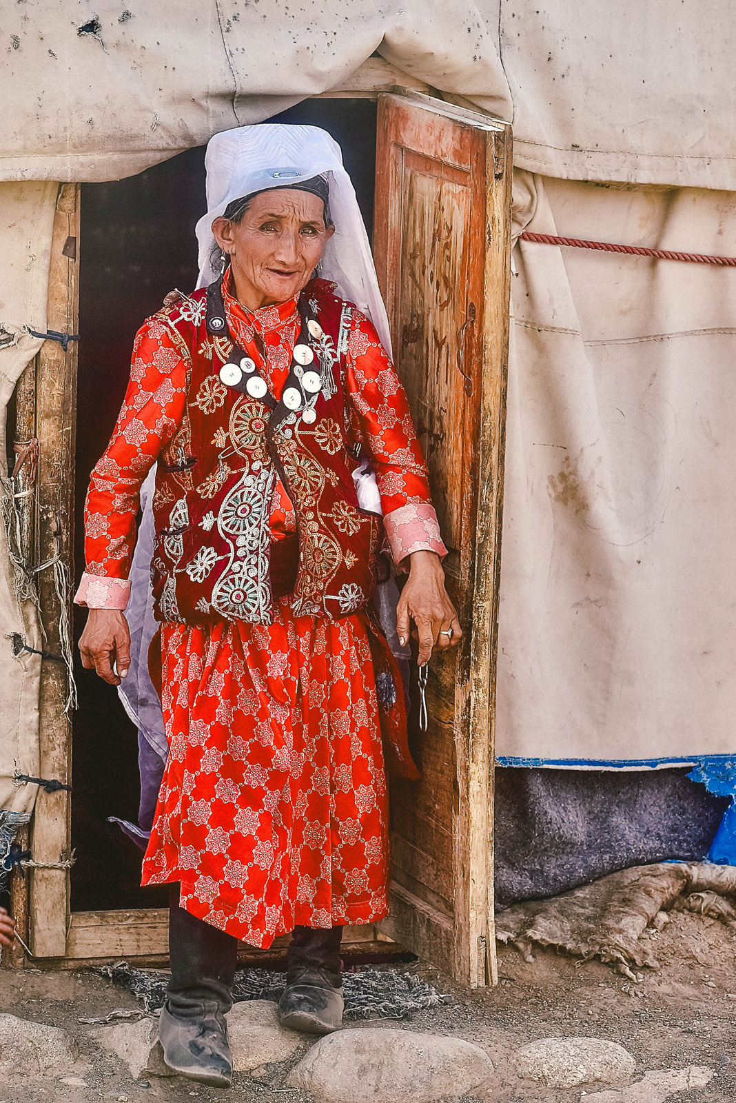 Red is the first thing that comes to mind when I think of the Kyrgyz nomads in Afghanistan’s Wakhan Corridor. Red is the color of Kyrgyz women. Red are their ankle-length dresses printed with ornaments. Red are their vests, embroidered with buttons and adorned with all kinds of jewelry. Red are the flowing headscarves of their unmarried daughters, which they wear over cylindrical hoods. Upon marriage, however, the headscarves turn white. Men wear just the tubeteika, a round cap embroidered with colorful patterns, and a light brown chapan (traditional coat) to protect them from the cold. Red is also the dominant color inside the yurts: carpets, folded blankets, pillows, clothing chests, wall hangings, and ceiling coverings—almost everything is red.