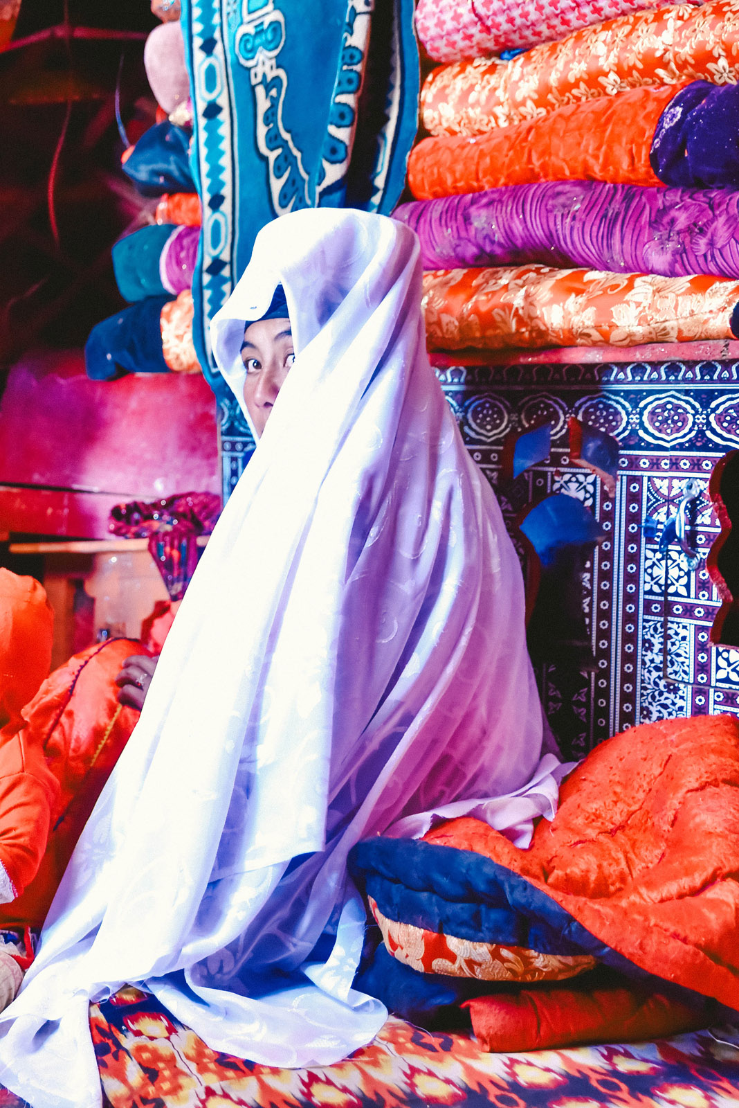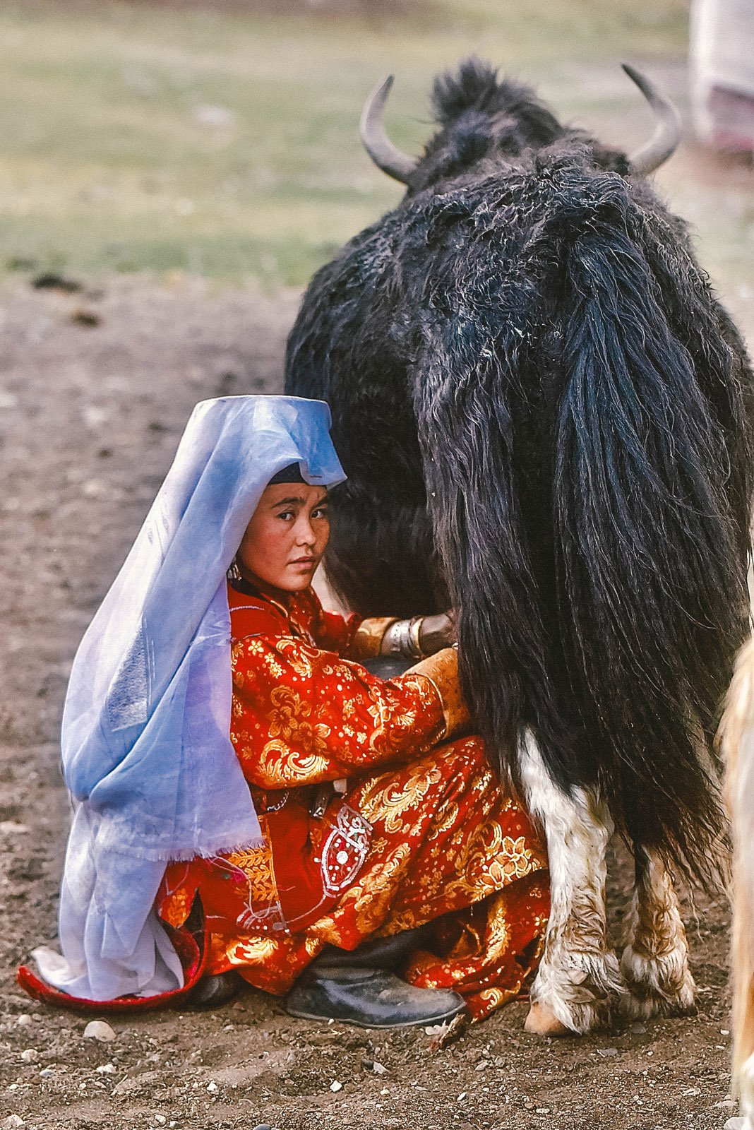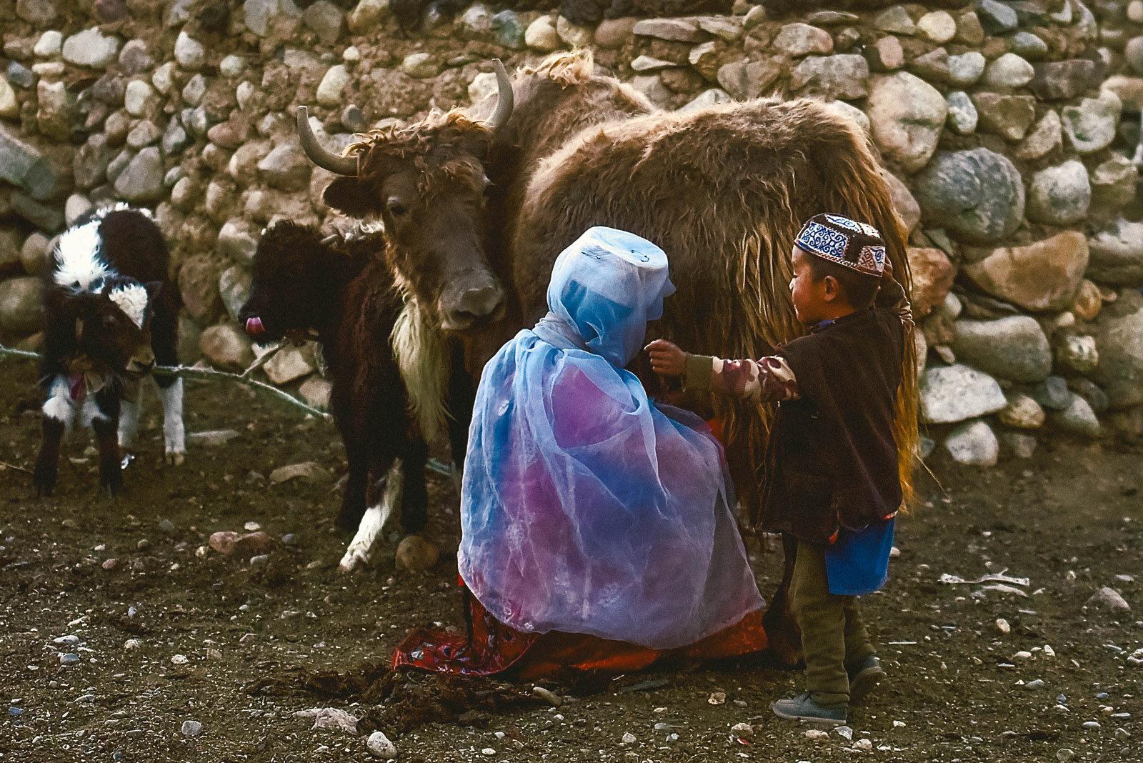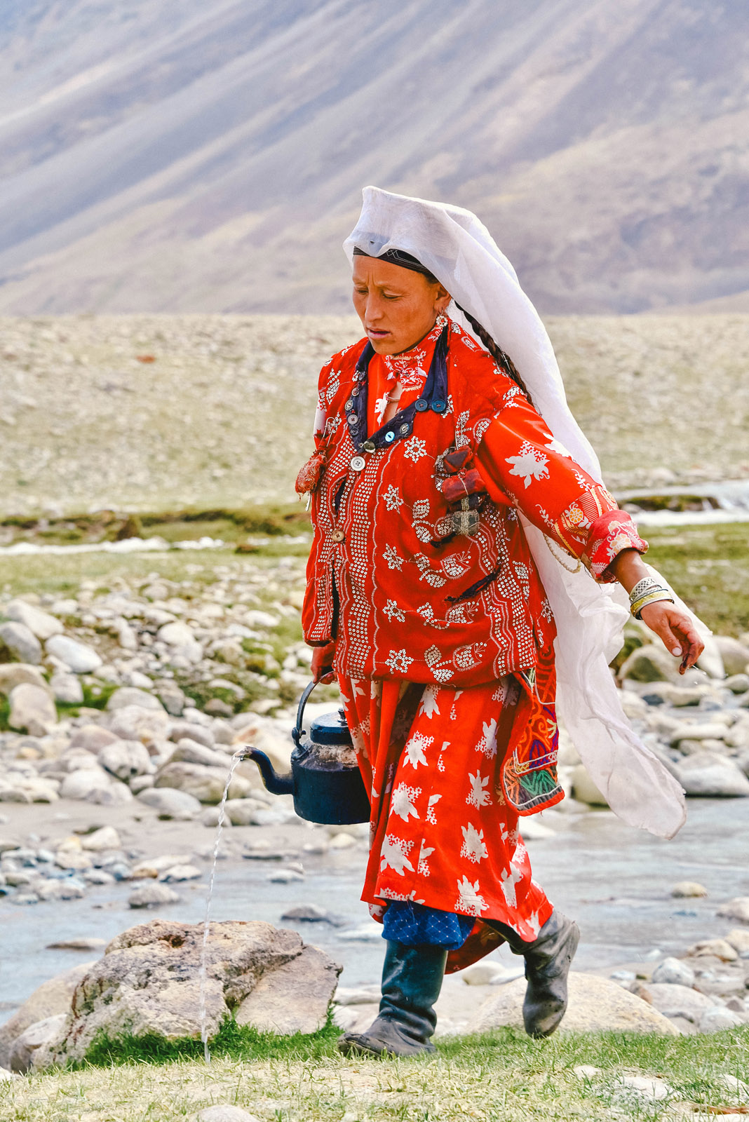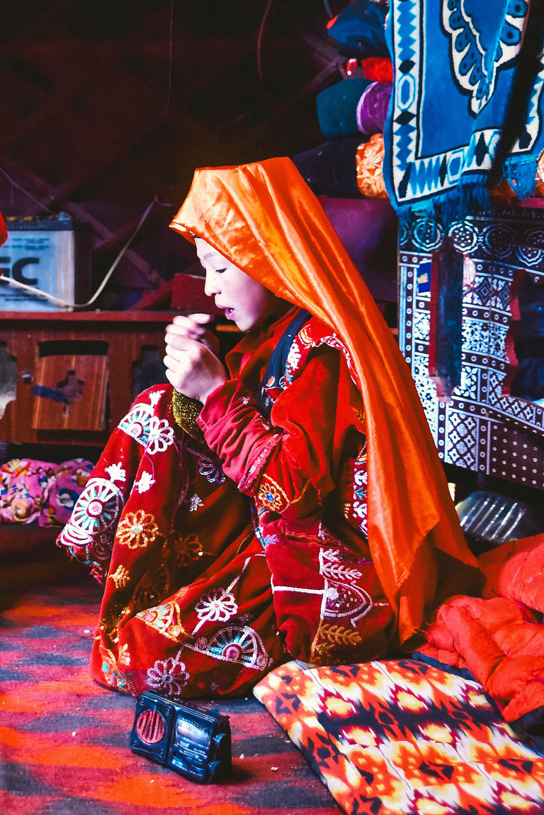 Red is the first thing that comes to mind when I think of the Kyrgyz nomads in Afghanistan’s Wakhan Corridor. Red is the color of Kyrgyz women. Red are their ankle-length dresses printed with ornaments. Red are their vests, embroidered with buttons and adorned with all kinds of jewelry. Red are the flowing headscarves of their unmarried daughters, which they wear over cylindrical hoods. Upon marriage, however, the headscarves turn white. Men wear just the tubeteika, a round cap embroidered with colorful patterns, and a light brown chapan (traditional coat) to protect them from the cold. Red is also the dominant color inside the yurts: carpets, folded blankets, pillows, clothing chests, wall hangings, and ceiling coverings—almost everything is red.