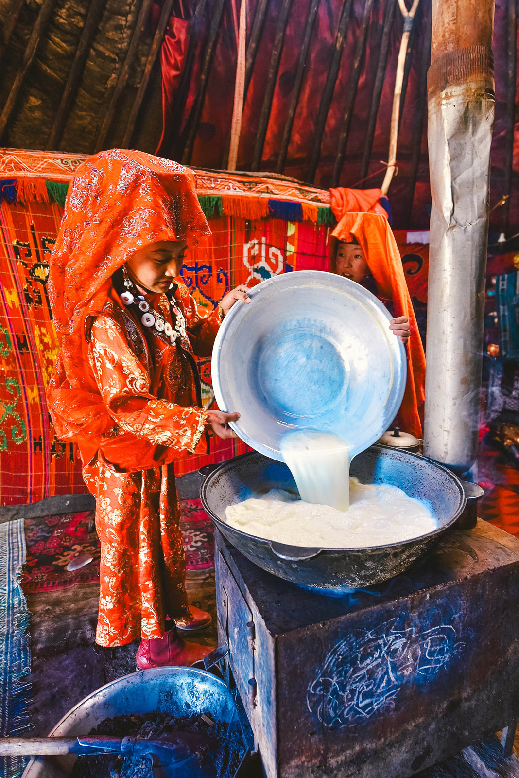 In the yurt, the women boil the milk and then process it into butter, yogurt, and “kurut,” a rock-hard dry curd cheese. They fill sheep stomachs with the butter, which keeps it fresh for months. Kurut is especially popular in winter when the animals do not give milk. The women have little time to chat with each other. They are constantly busy looking after the children, feeding the animals, cooking, fetching water from the stream, washing and sewing clothes, or collecting dung and stacking it up to dry. The girls are involved in these tasks from an early age; only the youngest ones we can see playing. One of the houses in the camp serves as a school for children from all the surrounding camps. There are currently 25 children, explains the young teacher from Kunduz. But only six came today.