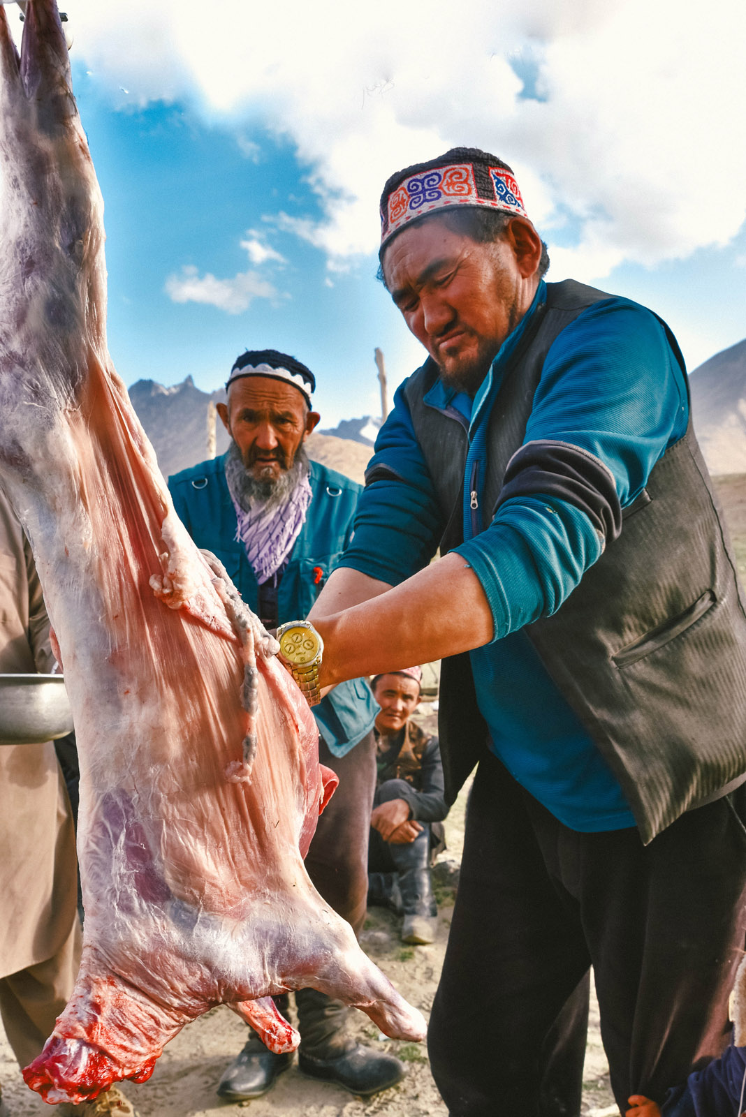 The mood relaxes when we ask Eimatambeg to slaughter a goat for us. This brings in more cash. For the Kyrgyz nomads, a sheep is still the basic unit of their currency: a cell phone costs one sheep. A yak costs about 10 sheep and a good horse 50. The going price for a bride is 100. With the completion of the road, however, cash is becoming more and more important. They need it for gasoline for their motorcycles, for the rare cars and to pay for the goods that traders from lower Wakhan offer in their delivery trucks several times a week. Right now – it’s mid-September – apples are in demand.
